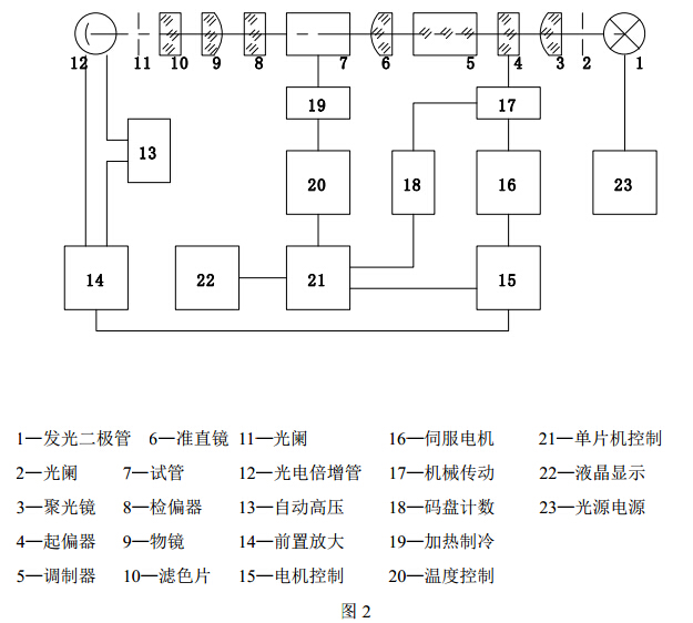 圖2是儀器的結構框圖。發(fā)光二極管發(fā)出的光依次通過光闌、聚光鏡、起偏器、法拉第調制器、準直鏡。形成一束振動面隨法拉第線圈中交變電壓而變化的準直的平面偏振光,經過裝有待測溶液的試管后射入檢偏器,再經過接收物鏡、濾色片、光闌、波長為 589.3nm 的單色光進入光電倍增管,光電倍增管將光強信號轉變成電訊號,并經前置放大器放大。自動高壓是按照入射到光電倍增管的光強自動改變光電倍增管的高壓,以適應測量透過率較低的深色樣品的需要。若檢偏器相對于射入的偏振光平面偏離正交位置,則通過頻率為 f 的交變光強信號,經光電倍增管轉換成頻率 f 的電信號,此電信號經過前置放大后輸入電機控制部分,再
