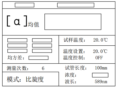 b) 測比旋度時,模式選 2,測量內容顯示比旋度,數(shù)據(jù)欄顯示[α]及[α] 均值,需要在設置時輸入試管長度(mm)、溶液濃度及測量次數(shù),腳標均值表示平均值。