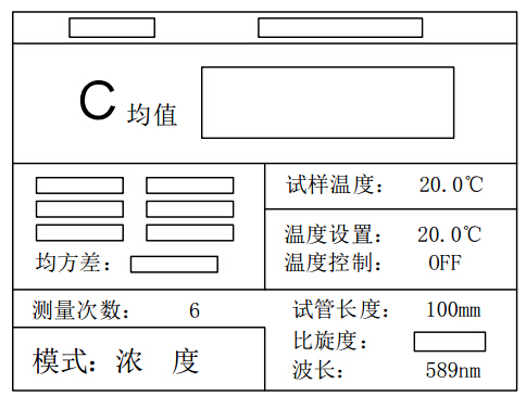 c) 測濃度時,模式選 3,測量內容顯示濃度,數(shù)據(jù)欄顯示 C 及 C 均值,需要輸入試管長度、比旋度及測量的次數(shù),若比旋度為負請輸入負值。