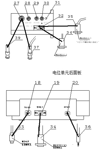 c. 用控制單元―――>電位測量單元專用連接線(34)將控制單元“測量接口”(19)和電位測量單元“測量接口/RS232”(32)連接起來。