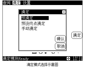 儀器共提供3種滴定模式,即預(yù)滴定模式、預(yù)設(shè)終點滴定模式、手動滴定模式等。在儀器的起始狀態(tài)下,按“滴定”鍵,或者按菜單項上的“滴定”項,儀器會顯示全部滴定模式,顯示如下,用戶可以選擇所需的滴定模式進行相應(yīng)的滴定。