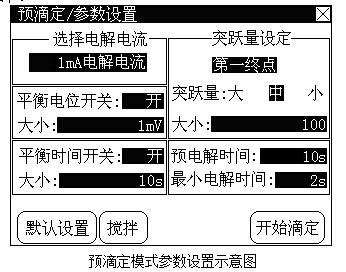 開始預(yù)滴定模式之前,需要進行一些預(yù)滴定模式參數(shù)的設(shè)置,這些參數(shù)包括:電解電流參數(shù)、最小電解時間參數(shù)、平衡電位參數(shù)、平衡時間參數(shù)、終點突躍量參數(shù)以及預(yù)電解時間參數(shù)等。這部分參數(shù)控制著儀器的預(yù)滴定模式,修改這部分參數(shù)將直接影響預(yù)滴定的結(jié)果,絕大多數(shù)情況下,用戶不必設(shè)置這部分參數(shù),即能滿足滴定要求。