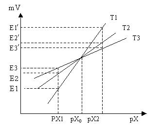 a) 當(dāng)被測(cè)溶液溫度t發(fā)生變化時(shí),電極系統(tǒng)產(chǎn)生的信號(hào)隨之發(fā)生變化,當(dāng)溶液溫度變化時(shí),一支電極的mV--pX直線族有一個(gè)交點(diǎn),這一點(diǎn)電位大小是不隨溶液溫度變化而變化,稱之為等電位點(diǎn),它對(duì)應(yīng)的pX值稱之為等電位的pX值一般以pX0表示。