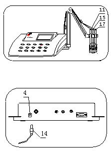 b) 將6801A型 pNa玻璃電極(11)、6802A甘汞電極(17)和T-818-B-6溫度傳感器(15)夾在多功能電極架(10)上。
