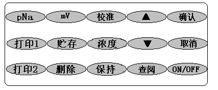 儀器共有15個(gè)操作鍵,分別為:ON/OFF、pNa、mV、濃度、校準(zhǔn)、打印1、打印2、貯存、刪除、查閱、保持、▲、▼、確認(rèn)和取消。