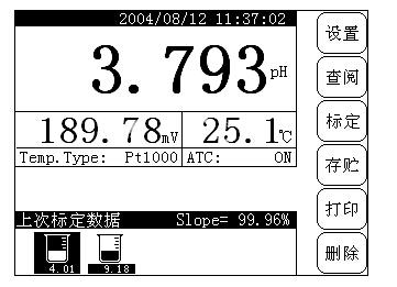 為了方便用戶使用,儀器一開機(jī)即進(jìn)入pH測量狀態(tài),顯示如圖(1)所示,其中顯示屏上方顯示有當(dāng)前的pH測量結(jié)果和系統(tǒng)時間、下方為對應(yīng)的電位和當(dāng)前溫度值以及溫度電極類型和自動溫度補(bǔ)償狀態(tài)提示;顯示屏右面為按鍵。圖中即表示儀器的起始狀態(tài)。