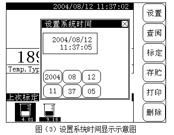 按“設(shè)置”鍵,再按“確認(rèn)”鍵,儀器進(jìn)入設(shè)置系統(tǒng)時間模塊,用戶可以設(shè)置系統(tǒng)時間,窗口上方為當(dāng)前的系統(tǒng)時間,下方為對應(yīng)的時間按鍵,包括“年”、“月”、“日”、“時”、“分”、“秒”鍵,顯示如圖(3)所示: