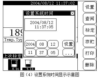 為了保證更好地使用本儀器,在正常使用前,用戶應(yīng)檢查一下系統(tǒng)的設(shè)置情況,包括系統(tǒng)時間、溫度電極類型、手動溫度值等等。在儀器的起始狀態(tài)下,用觸摸按“設(shè)置”鍵,儀器顯示設(shè)置菜單,用戶可以設(shè)置系統(tǒng)時間、mV分辨率、pH分辨率、手動溫度、溫度電極類型以及mV零點等,顯示如圖(2)所示: