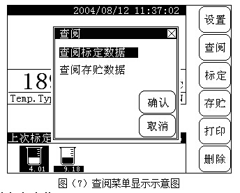 用戶可以查閱上次的標(biāo)定數(shù)據(jù)、標(biāo)液組;查閱存貯的測量結(jié)果。在儀器的起始狀態(tài),按“查閱”鍵,即可進(jìn)入查閱模塊。顯示如圖(7)所示: