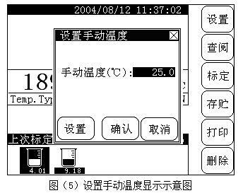 溫度傳感器插口如果連接有溫度傳感器時,儀器自動采用溫度傳感器的溫度值,反之,儀器采用用戶設(shè)定的手動溫度值作為當(dāng)前的溫度值。按“設(shè)置”鍵,選擇“手動溫度”項,按“確認(rèn)”鍵,儀器即進(jìn)入手動溫度設(shè)置模塊,顯示如圖(5)所示。按“設(shè)置”鍵或者直接在手動溫度值顯示區(qū)域按一下,儀器即彈出一個輸入窗口,用戶可輸入相應(yīng)的手動溫度值。設(shè)置完畢,儀器返回起始狀態(tài)。