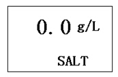 在儀器處于“滿度校準(zhǔn)”工作狀態(tài)下,按“模式”鍵,儀器即進(jìn)入鹽度設(shè)置”工作狀態(tài)。此時(shí)儀器顯示當(dāng)前設(shè)置的鹽度值,可以按“▲”鍵或“▼”鍵修改鹽度值,修改為實(shí)際鹽度值后,按“確定”鍵,貯存儀器修改后鹽度值,則完成鹽度設(shè)置。此時(shí),儀器還處于“鹽度校準(zhǔn)”工作狀態(tài)。再按“模式”鍵,儀器進(jìn)入“溶解氧濃度測量”工作狀態(tài)。鹽度設(shè)置顯示界面如下:
