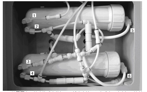 擰開(kāi)圖中6處連接膜殼的螺母,拔出水管,取出膜殼。注意記下管道連接膜殼的位置。