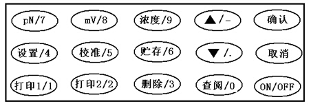 儀器有五種工作狀態(tài)。即pN測(cè)量、mV測(cè)量、濃度測(cè)量、設(shè)置、校準(zhǔn)。儀器各工作狀態(tài)可通過(guò)相應(yīng)的鍵進(jìn)行切換。