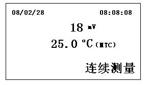 不論儀器處于何種工作狀態(tài),按“mV”鍵,儀器即進(jìn)入mV設(shè)置的測(cè)量方式工作狀態(tài),此時(shí)儀器顯示當(dāng)前的電極電位(mV)值和溫度值。其測(cè)量方式工作狀態(tài)的功能與pN相同。