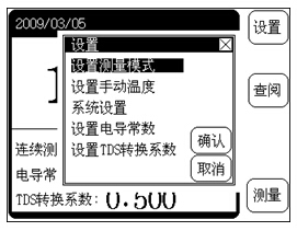 “設(shè)置電極常數(shù)”或者“設(shè)置TDS轉(zhuǎn)換系數(shù)”:可以由此進入設(shè)置電極常數(shù)、TDS轉(zhuǎn)換系統(tǒng)、溫度補償系數(shù)等功能模塊,方便使用。