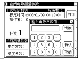 f. 按“標(biāo)稱電導(dǎo)”鍵,輸入表3中相應(yīng)溫度和濃度下的數(shù)據(jù),即當(dāng)前標(biāo)準(zhǔn)溶液的電導(dǎo)率值;