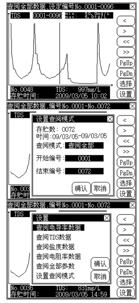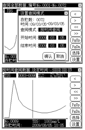 儀器顯示總的存貯數(shù)以及相應(yīng)的存貯時間范圍。用戶按照實際需要可以選擇相應(yīng)的查閱模式:查閱全部數(shù)據(jù)、按編號查閱、按時間查閱等。