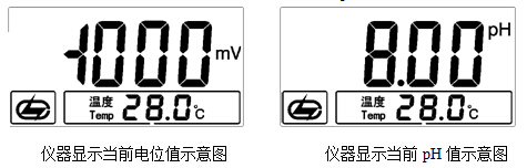 其中顯示屏上方為當前的電位值或者pH值,下方為設(shè)定的溫度值。