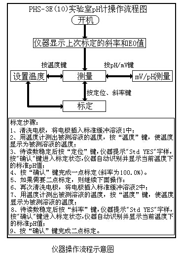在測量狀態(tài)下,按“mV/pH”鍵可以切換顯示電位以及pH值;按“溫度”鍵設(shè)置當前的溫度值;按“定位”或“斜率”鍵標定電極斜率,簡要的操作流程見下圖: