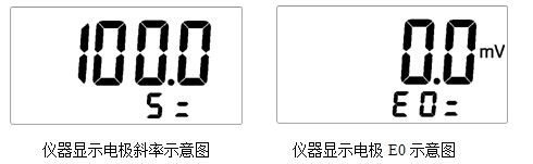 鍵,儀器存貯當前的標定結(jié)果,并顯示斜率和E0值,返回測量狀態(tài);如果用戶想放棄標定,可按“pH/mV”鍵,儀器退出標定狀態(tài),返回當前測量狀態(tài)。