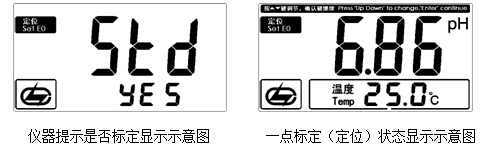 進入標定狀態(tài)后,儀器會自動識別當前標液并顯示當前溫度下的標準pH值,顯示如圖(此時顯示的數(shù)據(jù)可能與測量狀態(tài)下的pH值不同),按“確認”