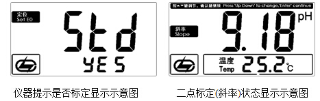 c) 同理,再次清洗電極并插入標準緩沖溶液2中(pH=9.18pH的標準緩沖溶液中);如儀器沒接溫度電極則可用溫度計測出溶液的溫度值(如25.2℃),并設(shè)置溫度值;稍后,待讀數(shù)穩(wěn)定后,按“斜率”鍵,再確認,儀器自動識別當前標液并顯示當前溫度下的標準pH值(如9.18pH),顯示如圖: