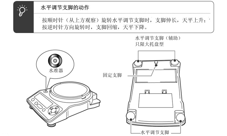 本天平由位于主機底部的后部中央固定支腳(1點)和前部左右水平調(diào)節(jié)支腳(2點)