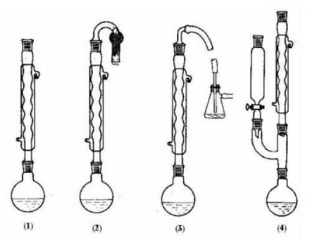 很多有機(jī)化學(xué)反應(yīng)需要在反應(yīng)體系的溶劑或液體反應(yīng)物的沸點(diǎn)附近進(jìn)行,這時(shí)就要用回流裝置。包括普通加熱回流裝置、防潮加熱回流裝置、帶有吸收反應(yīng)中生成氣體的回流裝置(適用于回流時(shí)有水溶性氣體(如:HCl、HBr、SO2等)產(chǎn)生的實(shí)驗(yàn))和回流時(shí)可以同時(shí)滴加液體的裝置,圖示如下: