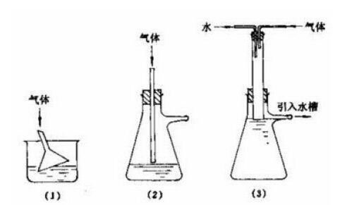 (1)和(2)可作少量氣體的吸收裝置。(1)中的玻璃漏斗應(yīng)略微傾斜使漏斗口一半在水中,一半在水面上。這樣,既能防止氣體逸出,亦可防止水被倒吸至反應(yīng)瓶中。若反應(yīng)過程中有大量氣體生成或氣體逸出很快時(shí),可使用圖(3)的裝置,水自上端流入(可利用冷凝管流出的水)抽濾瓶中,在恒定的平面上溢出。粗的玻管恰好伸入水面,被水封住,以防止氣體逸人大氣中。圖中的粗玻管也可用Y形管代替。