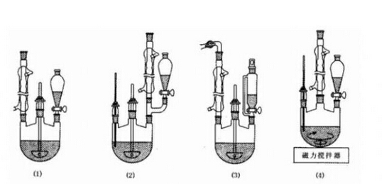 (1)是可同時(shí)進(jìn)行攪拌、回流和自滴液漏斗加入液體的實(shí)驗(yàn)裝置;(2)的裝置還可同時(shí)測(cè)量反應(yīng)的溫度;(3)是帶干燥管的攪拌裝置;(4)是磁力攪拌器裝置。