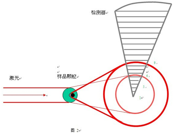 激光粒度儀是基于光衍射現(xiàn)象而設(shè)計(jì)的,當(dāng)顆粒通過激光光束時(shí),顆粒表面會(huì)衍射光,而衍射光的角度與顆粒的粒徑成反向的變化關(guān)系,即大顆粒衍射光的角度小,小顆粒衍射光的角度大,如圖 1 所示。