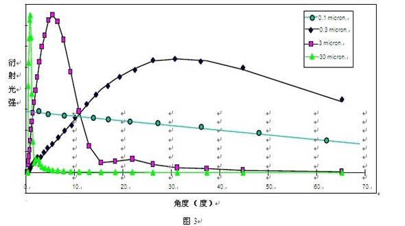 然后再通過該位置的檢測器所接收到的衍射光的強(qiáng)度,得到所對應(yīng)粒徑顆粒的百分比含量。但是,顆粒衍射光的強(qiáng)度對角度的依賴性是隨著顆粒粒徑的變小而降低,如圖 3 所示。當(dāng)顆粒小到幾百納米時(shí),其衍射光強(qiáng)對于角度幾乎完全失去依賴性,即此時(shí)的衍射光會(huì)分布在很寬的角度范圍內(nèi),而且單位面積上的光強(qiáng)很弱,這無疑增加了檢測的難度。