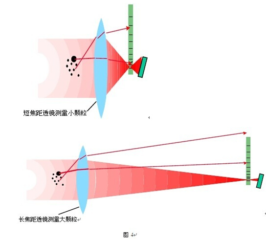 多透鏡系統(tǒng)曾在二十世紀(jì)八十年代前被廣泛采用,它使用傅里葉光路配置即樣品池放在聚焦透鏡的前方,配有多個(gè)不同焦距的透鏡以適應(yīng)不同的粒徑范圍,如圖 4 所示,優(yōu)點(diǎn)是設(shè)計(jì)簡單,只需要分布于幾十度范圍的焦平面檢測器,成本較低。缺點(diǎn)是如果樣品粒徑范圍寬的時(shí)候需要更換透鏡,不同透鏡的結(jié)果需要拼合,對一些未知粒徑的樣品用一個(gè)透鏡測量時(shí)可能會(huì)丟失信號(hào)或?qū)τ谟捎诠に囎兓瘜?dǎo)致的樣品粒徑變化不能及時(shí)反映。