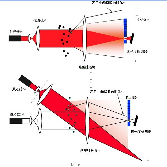 多光源技術(shù)也是采用傅里葉光路配置即樣品池在聚焦透鏡的前方,一般只有分布于幾十度角度范圍的檢測器,為了增大相對的檢測角度,使該檢測器能夠接收到小顆粒的衍射光信號(hào),在相對于第一光源光軸的不同角度上再配置第一或第二激光器,如圖 5 所示。這種技術(shù)的優(yōu)點(diǎn)是只需分布于幾十度角度范圍的檢測器,成本較低,測量范圍特別是上限可以比較寬,缺點(diǎn)是分布于小角度范圍的小面積檢測器同時(shí)也被用于小顆粒測量,由于小顆粒的衍射光在單位面積上的信號(hào)弱,導(dǎo)致小顆粒檢測時(shí)的信噪比降低,這就是為什么多光源系統(tǒng)在測量范圍上限超過 1500 微米左右時(shí),若要同時(shí)保證幾微米以下小顆粒的準(zhǔn)確測量,需要更換短焦距的聚焦透鏡。另外,多透鏡系統(tǒng)在測量樣品時(shí),不同的激光器是依次開啟,而在干法測量時(shí),由于顆粒只能一次性通過樣品池,只有一個(gè)光源能被用于測量,所以一般采用多透鏡技術(shù)的干法測量的粒徑下限很難低于 250 納米。