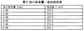 由于此試驗(yàn)方法的關(guān)鍵在于氫氟酸濃度的測定,故在此選擇影響氫氟酸濃度的幾個條件試驗(yàn)加以驗(yàn)證。加入鈦含量對于氫氟酸的影響:在上述1.1(4)中的標(biāo)準(zhǔn)氟化物中取6個8ml的標(biāo)準(zhǔn)氟化物,分別向每個容量瓶中加入lmg/ml的純鈦溶液lml,2ml,3ml,4ml,5ml,6ml,用飽和醋酸鈉稀釋至刻度,再分測其電位。