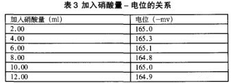 此溶液中含有一定濃度的硝酸,此試驗(yàn)測試在不同濃度的硝酸下對測定氫氟酸濃度的影響。在以上1.1.(4)標(biāo)準(zhǔn)氟化物的溶液中取6個4ml的標(biāo)準(zhǔn)氟化物,分別向每個容量瓶中加入2ml,4ml,6ml,8ml,10ml,12ml濃硝酸,以飽和醋酸鈉稀釋至刻度,分測其電位。實(shí)驗(yàn)數(shù)據(jù)如表3。