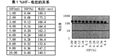根據(jù)上面標(biāo)準(zhǔn)曲線顯示:氫氟酸濃度在0.04%一0.4%之間濃度和電位值的半對數(shù)之間呈直線關(guān)系。故可以依據(jù)此標(biāo)準(zhǔn)曲線,和測得的待測氫氟酸的電位值查出待測氫氟酸的濃度。