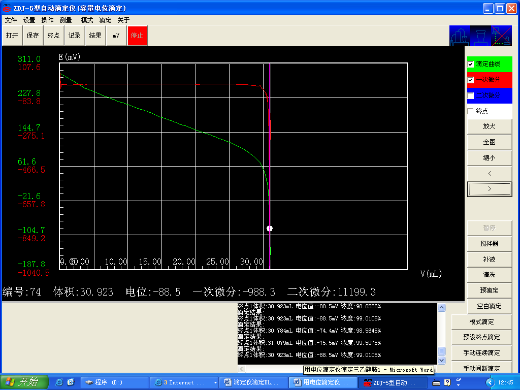 終點電位:-88.5mV 終點體積:30.923ml