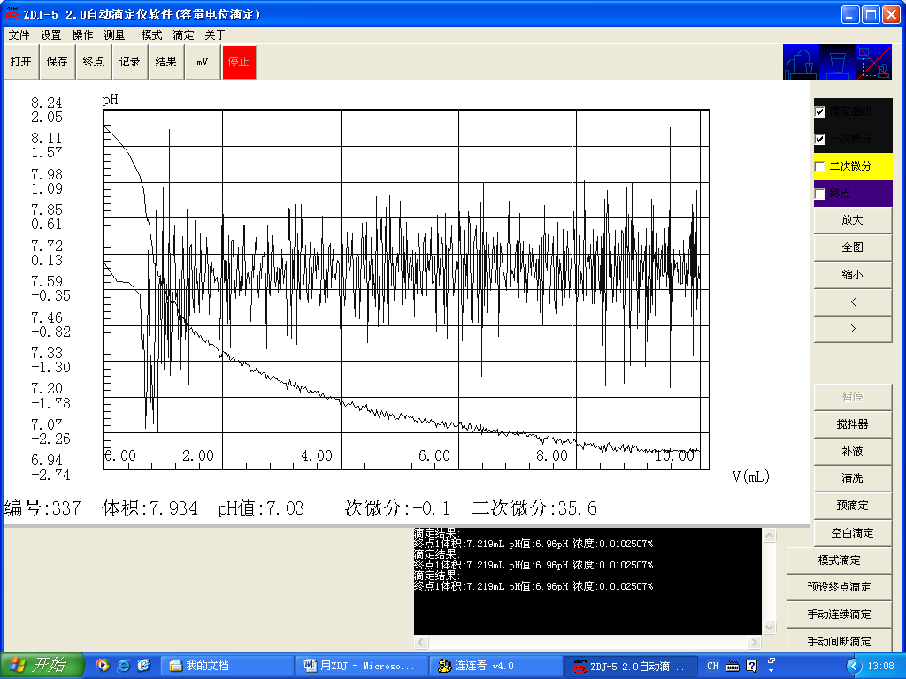 滴定模式:(1)本樣品測試用預(yù)滴定模式滴定效果較差,滴定終點不明顯。(2)采用預(yù)設(shè)終點模式滴定。設(shè)定滴定終點pH=7,預(yù)控點pH=7.05開始滴定,滴定結(jié)果如圖: