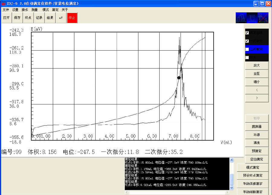 準(zhǔn)確稱取雙甘膦0.18g(精確至0.0002g)于50ml滴定杯中,放入攪拌珠,加入三乙醇胺5ml,緩沖溶液20ml。儀器自動(dòng)判別滴定終點(diǎn),顯示測試結(jié)果。