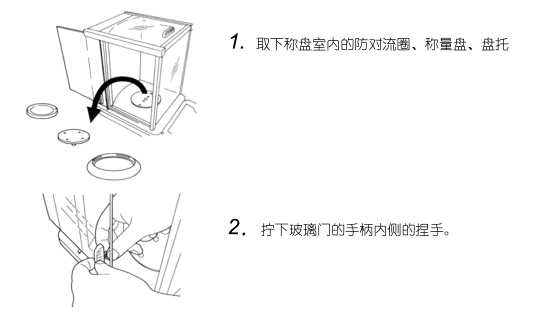 砠下玻璃門手柄內(nèi)側(cè)的捏手時(shí),請(qǐng)小心謹(jǐn)慎,手不要碰到稱量室內(nèi)的盤托軸。