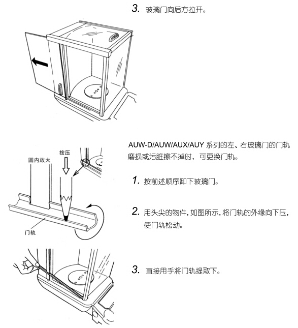 操作時(shí)請(qǐng)?zhí)貏e小心不要讓門軌劃傷手。玻璃拉門不滑時(shí)AUW-D/AUW/AUX/AUY系列可以卸下玻璃門,清掃門軌。