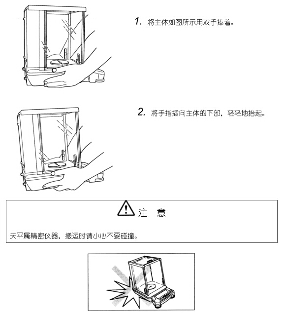 用手搬運(yùn)時(shí):取下稱量室內(nèi)的防對(duì)流圈、稱量盤、盤托后,如圖所示抬起,用雙手牢牢抓住搬運(yùn)。
