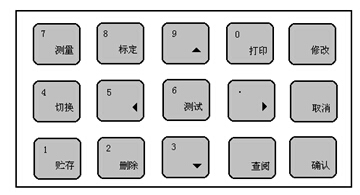 儀器面板上共有15個操作鍵,分別為:貯存/1、刪除/2、6/3、切換/4、3/5、測試/6、測量/7、標(biāo)定/8、5/9、打印/0、4/.、查閱、確認(rèn)、取消、修改。除了“查閱”、“確認(rèn)”、“取消”、“修改”四個鍵是單功能以外,其他的鍵都是復(fù)用的,它們有兩種功能,即既有功能鍵又有數(shù)字鍵的作用,平時它們作為功能鍵,按這些鍵可以完成相應(yīng)的功能;而第二功能即為數(shù)字鍵,當(dāng)且僅當(dāng)需要輸入數(shù)據(jù)時,這些鍵作為數(shù)字鍵。如“測量/7”鍵,平時按此鍵,可以在儀器的起始狀態(tài)下進(jìn)入測量狀態(tài);在輸入數(shù)字時,按此鍵,將輸入數(shù)字“7”。