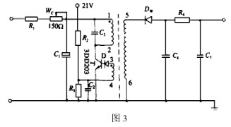 此種情況最常見(jiàn) ,也是牽涉面最廣的。首先應(yīng)測(cè)量各電路板電位測(cè)試點(diǎn)與零電位的直流電壓 , 從左至右的正常值分別為 + 21V , -600 ~ 1200V , + 5 ~ 6V , +3 1 5 ~ + 4V , 若電壓值偏離過(guò)大 , 則說(shuō)明故障多出在此電路板上。在選頻放大板上重點(diǎn)檢查3DJ6F 、 3DG6B 各管。在功率放大板上應(yīng)重點(diǎn)檢查 3DG102B 和 3DD130A 各管。根據(jù)筆者經(jīng)驗(yàn) , 此種電路故障主要出在高壓振蕩電路 ( 即第二塊電路板上 ) 。電路圖如圖 3 。由此電路將直流穩(wěn)壓電源提供的 21V 電壓 , 經(jīng)高壓振蕩控制電路控制 , 由高頻振蕩變壓器產(chǎn)生振蕩 , 變?yōu)榻涣?nbsp;, 然后經(jīng)變壓整流變?yōu)橹绷魈峁┙o光電倍增管 600 ~ 1200V 的負(fù)電壓。 調(diào)節(jié) W c 可改變振蕩的強(qiáng)弱 , 從而調(diào)節(jié)輸出電壓的高低。若調(diào)節(jié) W c 無(wú)法使測(cè)量頭電壓達(dá)到 - 600V 以上時(shí) , 可先檢查 T (3DD203) 管的基極、發(fā)射極間是否有 0 17V左右的電壓 , 若無(wú)則此管壞。 再查穩(wěn)流二極管 D W 是否壞。 最后將檢查的重點(diǎn)放在高壓振蕩器上。由于次級(jí)線圈5 、 6 繞組的匝數(shù)比 1 、 2 和 3 、 4 繞組的匝數(shù)多得多 , 且繞的導(dǎo)線相當(dāng)細(xì) , 電壓又高 , 因此很容易引起匝間短路或斷路 , 使輸出電壓變小或無(wú)輸出。因此此振蕩器最易損壞。