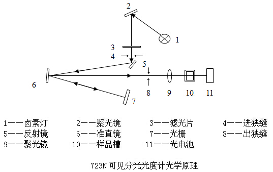 鹵素燈發(fā)出的連續(xù)輻射光經(jīng)球面聚光鏡聚光后通過濾光片投向單色器進狹縫,此狹縫正好于聚光鏡及單色器內(nèi)準直鏡的焦平面上,因此進入單色器的復合光通過平面反射鏡反射及準直鏡準直變成平行光射向色散元件光柵,光柵將入射的復合光通過衍射作用形成按照一定順序均勻排列的連續(xù)的單色光譜,此單色光譜再重新回到準直鏡上,由于儀器出射狹縫設(shè)置在準直鏡的焦平面上,這樣,從光柵色散出來的光譜經(jīng)準直鏡后利用聚光原理成象在出射狹縫上,出射狹縫選出指定帶寬的單色光通過聚光鏡落在試樣室被測樣品中心,樣品吸收后透射的光經(jīng)光門射向光電池接收。