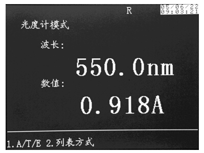 光度計模式為定波長的吸光度、透射比和能量方式測量,顯示分為大模式和列表形式。在此項功能中可進行消除比色皿配對誤差的操作(具體操作見28頁8章節(jié)介紹)。