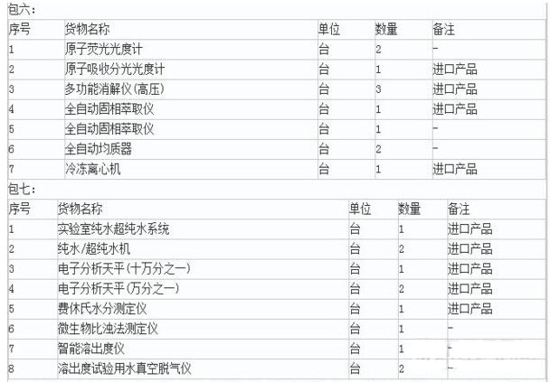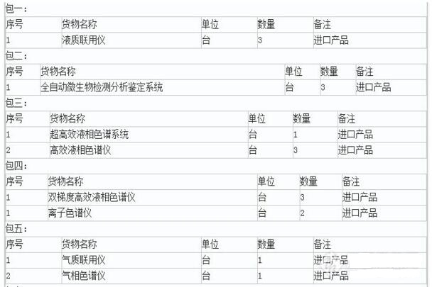 山西省國際招標(biāo)公司受山西省食品藥品監(jiān)督管理局委托,近期擬2119萬采購色譜、質(zhì)譜等食藥設(shè)備。此次公開招標(biāo)共分為了七包,資金來源為財政資金,涉及到的儀器設(shè)備包括了液質(zhì)聯(lián)用儀、超高效液相色譜系統(tǒng)、離子色譜儀、氣質(zhì)聯(lián)用儀、氣相色譜儀和雙梯度高效液相色譜儀等,其中大部分儀器設(shè)定為進(jìn)口儀器品牌。