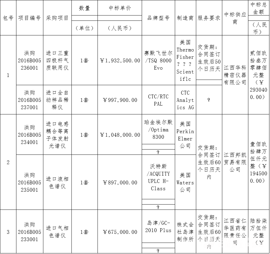 2016年7月18日,南昌市疾病預(yù)防控制中心進(jìn)口設(shè)備采購項(xiàng)目中標(biāo)結(jié)果公布,賽默飛世爾、沃特世、島津等全球知名企業(yè)入圍,分別是賽默飛世爾公司的進(jìn)口三重四極桿氣質(zhì)聯(lián)用儀、CTCAnalyticsAG(瑞士思特斯分析儀器公司)的進(jìn)口全自動(dòng)樣品稀釋儀、美國PE的進(jìn)口電感耦合等離子體發(fā)射光譜儀、Waters公司的進(jìn)口液相色譜儀以及島津公司的進(jìn)口氣相色譜儀。