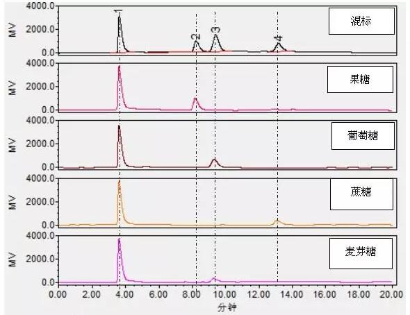 上述測試過程中使用的是4種糖的混合標準溶液,每個峰對應(yīng)的待測組分還是未知的,因此在該儀器分析條件下先對各組分進行單標確認。